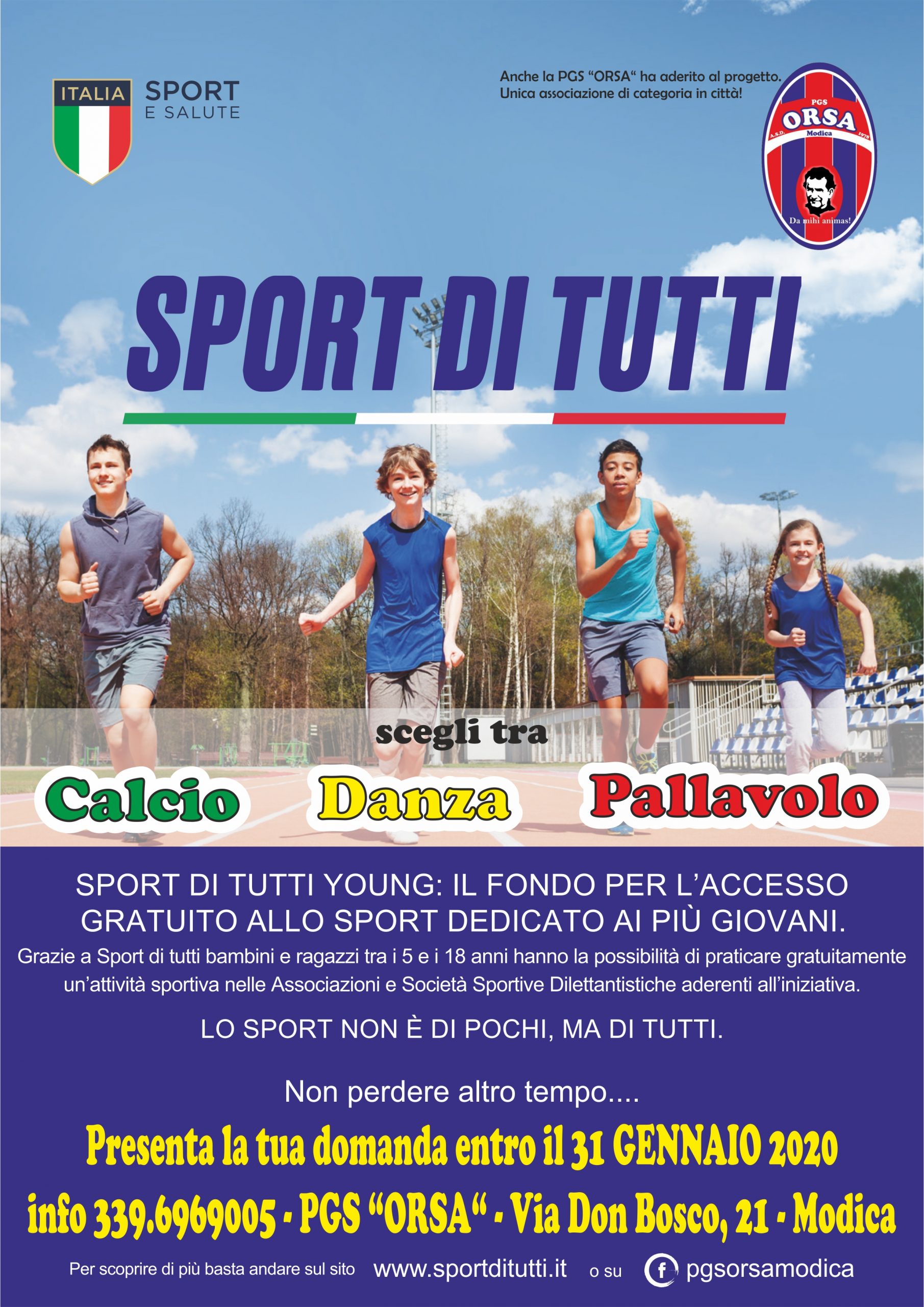 Bellissima iniziativa sociale organizzata dal Coni a livello nazionale dal titolo “Sportditutti” a cui ha aderito la PGS Orsa Modica. Il progetto è rivolto ai ragazzi dai 5 ai 17 anni che vogliono fare sport, ma non hanno possibilità economiche. Attraverso questa  iniziativa si avrà la possibilità di fare sport gratuitamente. La PGS Orsa di Modica ha aderito con le discipline del Calcio, Danza e Pallavolo.