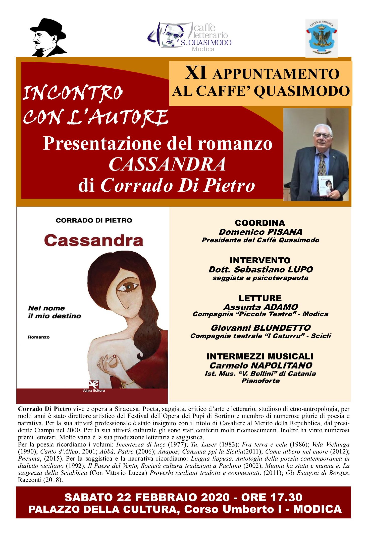 La serata, che sarà coordinata da Domenico Pisana, Presidente del Caffè Quasimodo, vedrà la presentazione del romanzo di Di Pietro dal titolo “Cassandra. Nel nome il mio destino”, edito da Algra Editore.