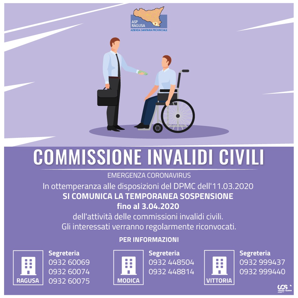 L’Asp di Ragusa, in ottemperanza a quanto previsto dal Dpcm dell’11 marzo 2020, per contenere la diffusione del Covid-19, ha sospeso, temporaneamente, e fino al 3 aprile prossimo le attività delle Commissioni Invalidi Civili.