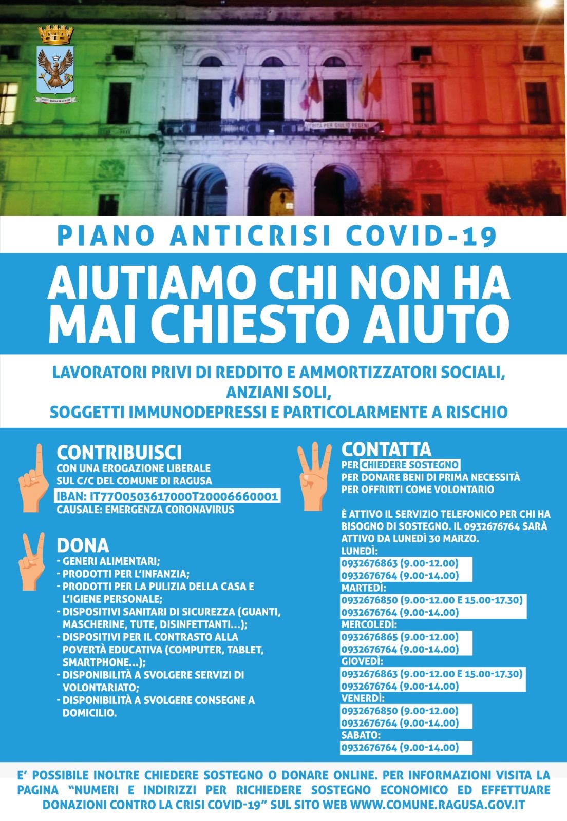 Si riporta di seguito un riepilogo sulle informazioni dell’intero servizio, consultabili anche sul sito web del Comune di Ragusa alla pagina “Numeri e indirizzi per richiedere sostegno economico ed effettuare donazioni contro la crisi Covid-19”: