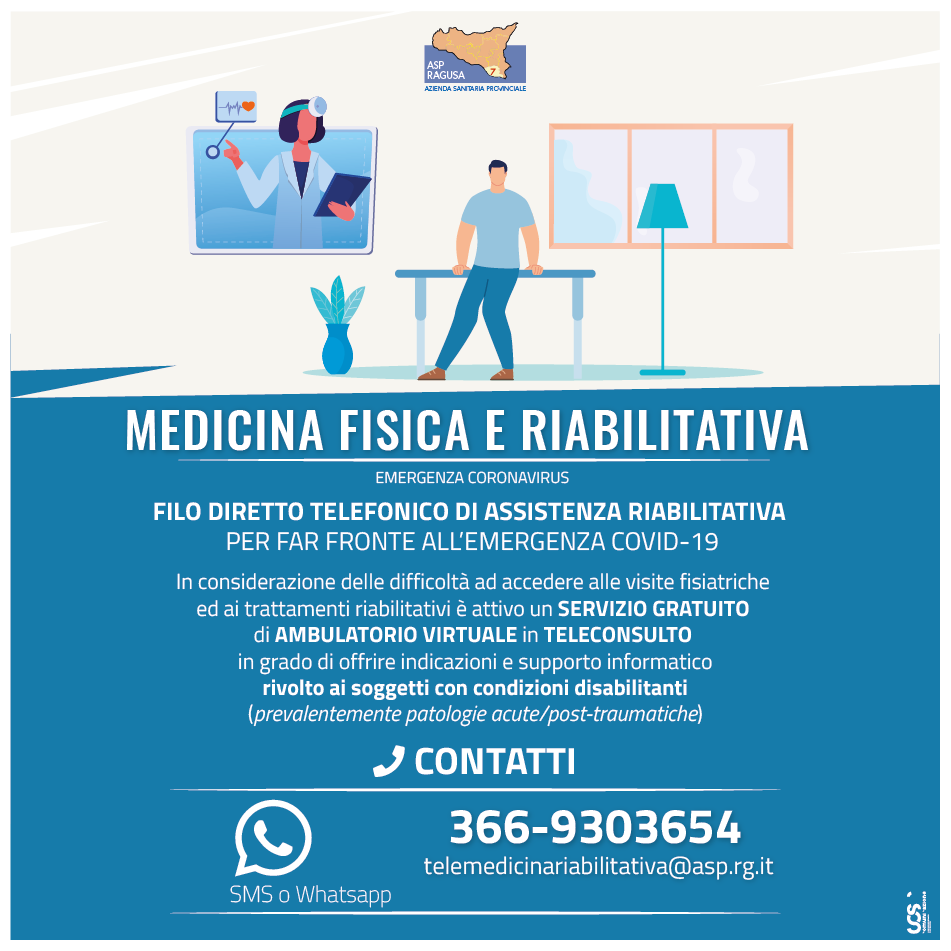 Un ambulatorio virtuale in teleconsulto è stato attivato dal Servizio di Medicina Fisica Riabilitativa dell’Asp di Ragusa per attenuare le difficoltà, causate dall’emergenza covid-19, ad accedere alle visite fisiatriche e ai trattamenti riabilitativi.