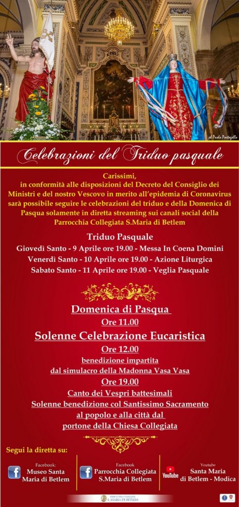 Tutte le celebrazioni si potranno seguire sulle pagine Facebook: Museo Santa Maria di Betlem, Parrocchia Collegiata S. Maria di Betlem, e sul canale YouTube Santa Maria di Betlem – Modica.