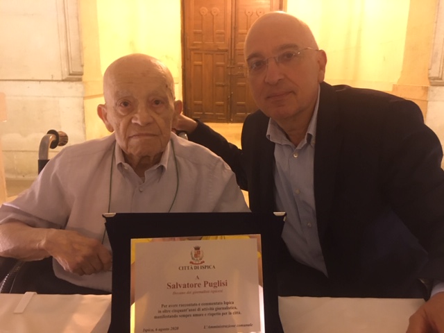 Ispica ha festeggiato il decano dei giornalisti locali, Salvatore Puglisi. Nel corso della riuscita serata di presentazione di “Cronache & Storie”, il libro stampato da Kromatoedizioni che raccoglie gli articoli più significativi scritti da Puglisi negli ultimi anni, il vice sindaco Gianni Stornello, a nome di tutta l’Amministrazione comunale, ha consegnato al giornalista una targa celebrativa “per avere raccontato e commentato Ispica in oltre cinquant’anni di attività giornalistica, manifestando – è impresso sulla targa – sempre amore e rispetto per la città”. Salvatore Puglisi è stato corrispondente del Giornale di Sicilia, ha collaborato con Vita Diocesana, il settimanale della Diocesi di Noto, ha fondato, assieme ad un altro giornalista storico di Ispica, Diego Floriddia, Il Quindicinale, è stato redattore portante in ben tre radio locali cittadine (Radio Onde Nuove, prima, Radio Gamma successivamente e infine Radio Dimensione Musica, di cui è stato anche direttore responsabile).
