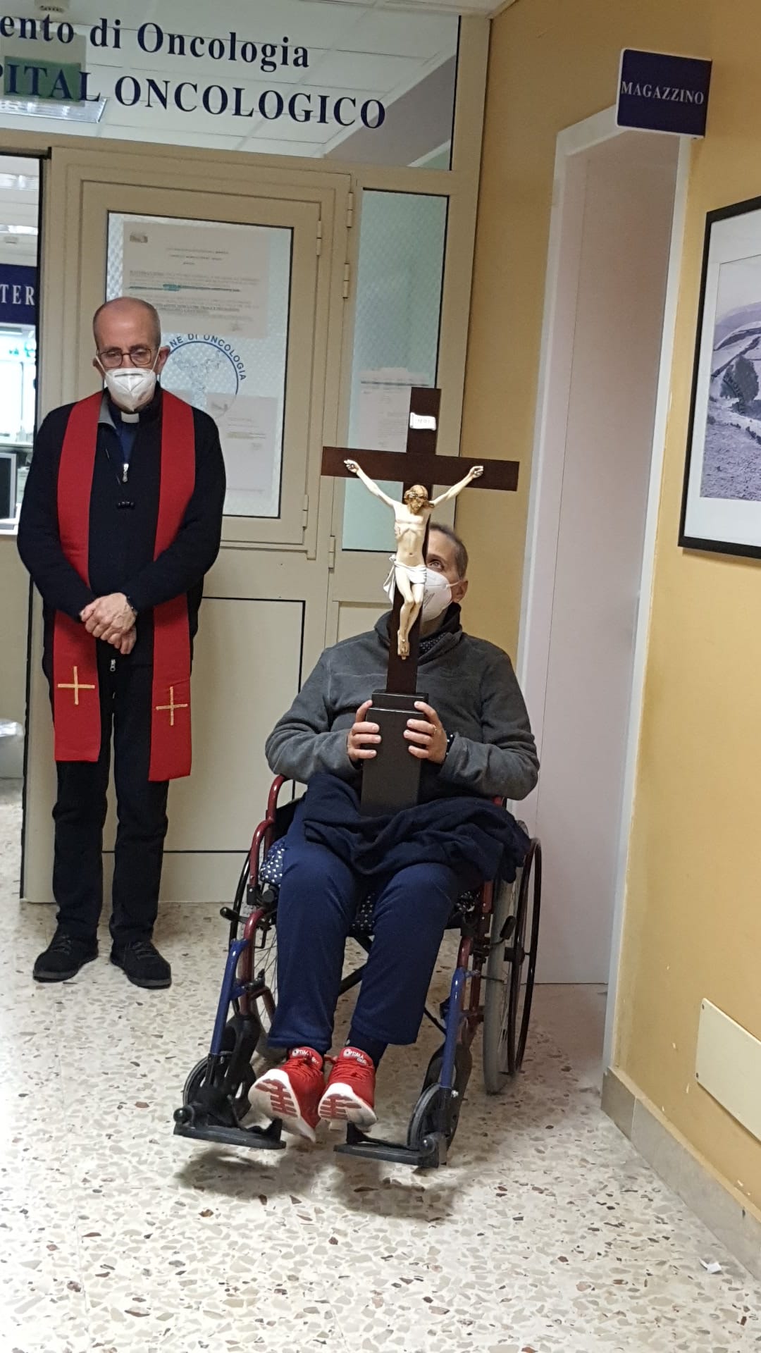 “Abbiamo regalato ai malati un momento di preghiera molto intenso con la Via Crucis del Venerdì Santo. Lo abbiamo fatto con il cammino di speranza che ha previsto soste in Hospice, Ematologia, Day hospital oncologico e dialisi. Una preghiera di forte intercessione è stata elevata al Signore per i malati Covid e per la fine della pandemia. Solidarietà intensa quella registrata negli ospedali. Dalla cura al prendersi cura”. Così il direttore dell’ufficio diocesano per la Pastorale della salute di Ragusa, il sacerdote Giorgio Occhipinti, nel descrivere il rito molto emozionante tenutosi ieri mattina nell’ospedale Maria Paternò Arezzo, con il coinvolgimento diretto dei degenti, alcuni dei quali hanno portato la croce. Nel pomeriggio, poi, la celebrazione della Passione del Signore si è tenuta nella portineria dell’ospedale Giovanni Paolo II dove è stato allestito un piccolo altare mentre poi il sacerdote, con il crocifisso, si è spostato al piano terra della torre B dove l’attenzione è stata rivolta a medici e operatori sanitari in genere. Oggi, intanto, alle 17, nella cappella dell’ospedale Civile, è in programma la veglia pasquale mentre domani, domenica di Pasqua, la messa solenne si terrà nella torre B, piano terra, del Giovanni Paolo II. “Ringrazio – continua don Occhipinti – chi mi ha assistito e i componenti della consulta della Pastorale della salute per il sostegno. E’ un momento difficile e il conforto spirituale ai malati e agli operatori sanitari, in questo periodo pasquale, assume un significato ancora più pregnante”.