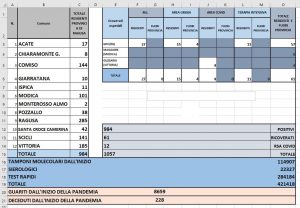 Resta stabile la curva epidemica in provincia di Ragusa ma nelle ultime 24 ore si contano due nuovi decessi. Il numero degli attuali positivi rimane sopra i 1000 casi è dal dato del report sugli indicatori territoriali della diffusione del Covid-19 si evince la crescita dei casi a Ragusa, Vittoria e Modica ma scende a Scicli (ancora in zona rossa). A Ragusa i casi sono in costanze crescita e si mantiene ancora il triste primato di prima città in provincia per numero di contagi. L’aumento dei positivi coinvolge pure Modica dove si registra in pochi giorni l’innalzamento dei numeri superando le 100 unità positive ma nel resto della provincia si registra una leggera flessione. I dati dei soggetti positivi a Scicli è di 141 (-7 rispetto a ieri), Acate 17 (-3), Chiaramonte 8 (-), Comiso 144 (+7), Giarratana 10 (-), Ispica 11 (+1), Modica 101 (+7), Monterosso 2 (-), Pozzallo 38 (-2), Ragusa 285 (+2), Santa Croce 42 (+4), Vittoria 185 (+8). Le persone positive sono 1057 (ieri erano 1060) di cui 984 in isolamento domiciliare, 61 ricoverate e 12 nella Rsa di Ragusa.