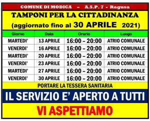 L’appuntamento è rinnovato a martedì 13 e venerdì 16, ancora martedì 20 e venerdì 23 e infine martedì 27 e venerdì 30 aprile dalle 16 alle 20 presso l’atrio comunale di Palazzo San Domenico. Ricordiamo che il servizio di tamponi rapidi è aperto a tutta la popolazione.