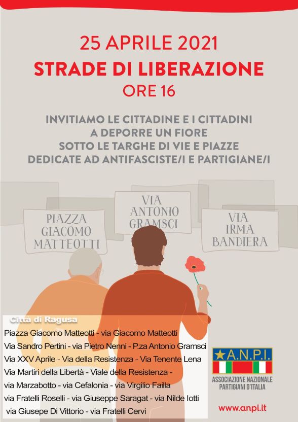 La Cisl partecipa domani, anche a Ragusa, all’iniziativa “Strade di liberazione” promossa dall’Anpi in occasione del 25 aprile, la festa di liberazione dal nazifascismo. I dirigenti della Cisl si riuniranno assieme agli organizzatori e agli altri aderenti all’iniziativa domani alle 16 in piazza Giacomo Matteotti (meglio conosciuta come piazza Poste), per deporre un fiore sotto le targhe di vie e piazze dedicate ad antifascisti e partigiani. L’iniziativa si svolgerà nel rispetto delle norme anticovid. Queste le vie cittadine individuate a Ragusa dall’Anpi dove, anche i semplici cittadini e le cittadine, potranno deporre un fiore per celebrare degnamente la ricorrenza del 25 aprile: via Giacomo Matteotti, via Sandro Pertini, via Pietro Nenni, piazza Antonio Gramsci, via XXV Aprile, via della Resistenza, viale Tenente Lena, via Martiri della Libertà, viale della Resistenza, via Marzabotto, via Cefalonia, via Virgilio Failla, via Fratelli Rosselli, via Giuseppe Saragat, via Nilde Iotti, via Giuseppe Di Vittorio, via Fratelli Cervi.