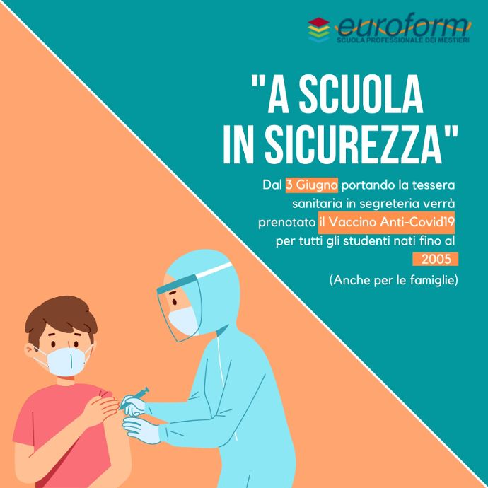Dal 3 giugno la Scuola Euroform di Modica prenoterà i vaccini per tutti i propri studenti e, a richiesta, anche per le famiglie. Basterà portare la tessera sanitaria in segreteria e in pochi minuti si otterrà l’appuntamento per ricevere la prima dose vaccinale presso il Centro Comprensoriale Vaccinazioni di Modica che è stato informato dell’iniziativa e subito si è mostrato disponibile ad appoggiarla. Considerando che per alcune classi della Scuola dei Mestieri l’ultima campanella suonerà nel mese di luglio, il vaccino rappresenta l’unica via percorribile per un sereno svolgimento delle lezioni sia pratiche che teoriche. L’obiettivo è quello di vaccinare almeno tutti gli alunni che rimarranno a scuola anche dopo la prima settimana di giugno ma, naturalmente, il servizio è offerto a tutti gli iscritti. Inoltre anche i componenti del nucleo familiare di un iscritto Euroform potranno usufruire della prenotazione semplicemente portando la tessera sanitaria presso la segreteria di Via Risorgimento a Modica