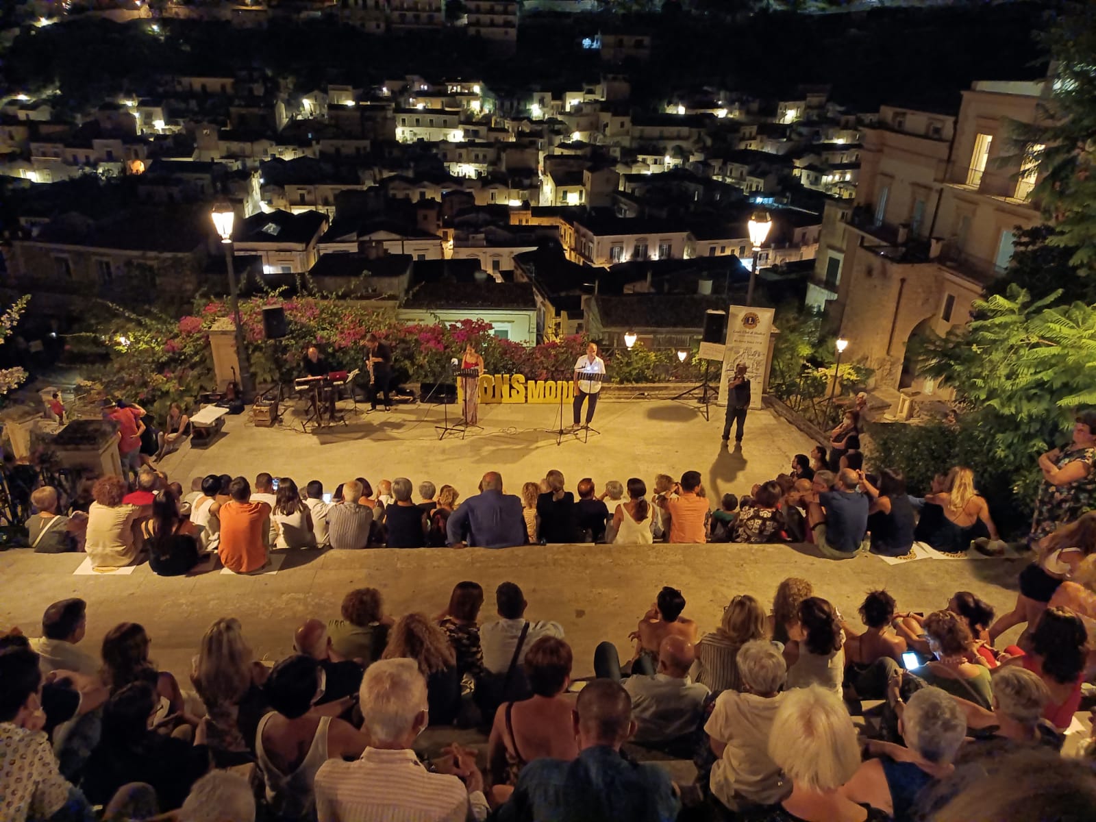 Scalinata degli orti di San Giorgio al completo per l’evento “Per le scale …piccoli passi di musica e letteratura…” organizzato dal Lions Club di Modica. Lucia Trombadore e l’attore Carlo Cartier hanno letto ed interpretato brani di due autori siciliani del Novecento: il poeta e premio Nobel Salvatore Quasimodo e lo scrittore Leonardo Sciascia, rispettivamente a 120 e 100 anni dalla nascita. Il tema della sicilianità ha fatto da filo conduttore fra i due autori riproponendo l’attualità e l’universalità dei loro messaggi. Ad accompagnare le letture il duo musicale composto da Carmelo Rendo alle tastiere e da Sergio Battaglia al sax. Prima dell’inizio dello spettacolo l’attore Alessandro Quasimodo, figlio del celebre poeta, ha tenuto a rivolgere un breve saluto al pubblico. “Il Lions Club di Modica – spiega il presidente Aurelio Boncoraglio – ha scelto come location dell’evento la scalinata di San Giorgio, luogo in cui la natura e l’arte barocca si sono incontrate per farne un teatro aperto sulla nostra città”.