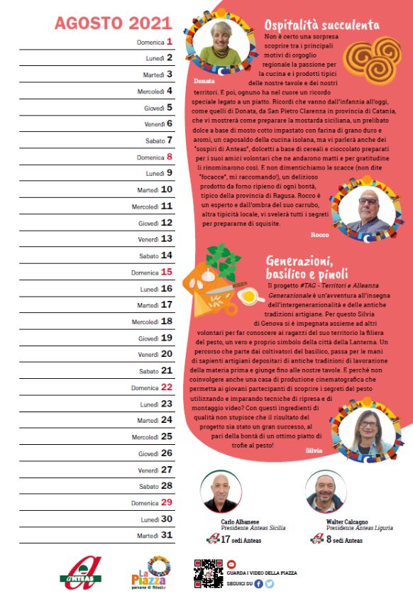 Quando l’ospitalità può diventare succulenta. Ne sa qualcosa Anteas che ha dedicato il proprio calendario nazionale ad elencare le specialità delle varie cucine regionali. E nello spazio dedicato al mese di agosto, ha trovato spazio, accanto alla mostarda siciliana preparata a San Pietro di Clarenza, in provincia di Catania, la specialità delle scacce ragusane. Protagonista di queste righe pubblicate sul calendario nazionale il presidente di Anteas Ragusa, Rocco Schininà. E’ scritto sul calendario, proprio con riferimento al mese di agosto: “E non dimentichiamo le scacce (non dite “focacce”, mi raccomando), un delizioso prodotto da forno ripieno di ogni bontà, tipico della provincia di Ragusa. Rocco è un esperto e dall’ombra del suo carrubo, altra tipicità locale, vi svelerà tutti i segreti per prepararne di squisite”. “Anteas, a livello nazionale – chiarisce Schininà – sta puntando sempre di più ad aggregare i territori, evidenziandone le caratteristiche, con una serie di iniziative che ci fanno sentire sempre più parte di questa realtà che esalta il volontariato, lo stare assieme e il sostegno ai più fragili. Bella idea quella di allestire un calendario raccontando le microstorie delle varie realtà provinciali e cittadine, decantando usi e costumi, soprattutto enogastronomici, di quegli stessi territori. A noi è toccato mettere in primo piano le scacce. E riteniamo di averlo fatto nel modo migliore, suscitando l’acquolina in bocca a tutti coloro che si sono informati per capire quali fosse le particolarità di questo prodotto da forno. E’ anche questo un modo per fare promozione al nostro territorio ed evidenziarne le caratteristiche volte pure ad esaltarne gli aspetti solidali”.