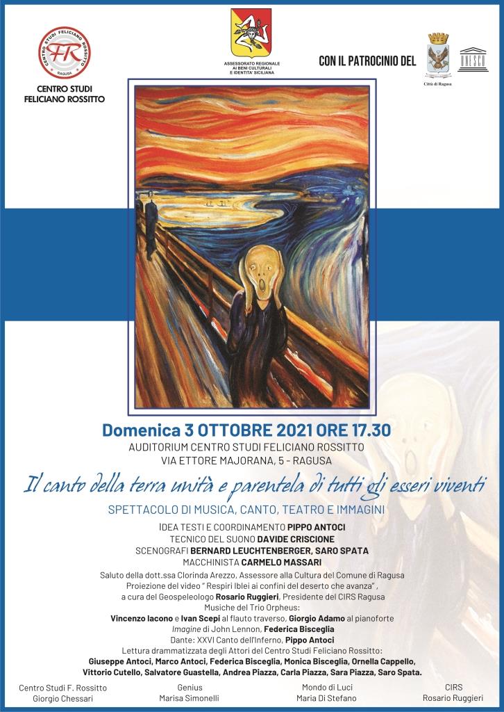 Domenica 3 ottobre, alle 17.30, nell’Auditorium del Centro Studi Feliciano Rossitto (Via Ettore Majorana, 5 – Ragusa), andrà in scena “Il canto della terra. Unità e parentela di tutti gli esseri viventi”. Uno spettacolo di musica, canto, teatro e immagini.