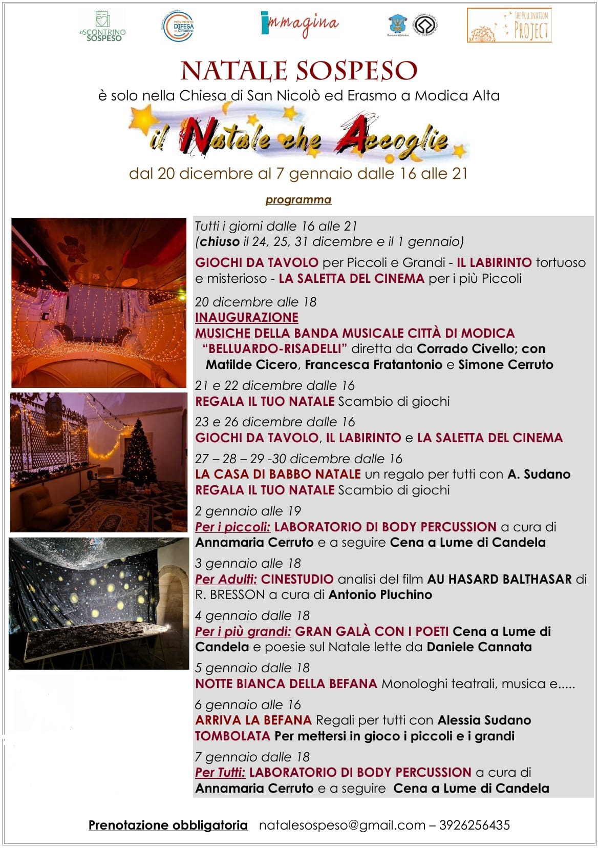 La città e il Movimento Difesa del Cittadino sentitamente ringrazia: Natale Sospeso che tende a valorizzare i Luoghi: la Chiesa di San Nicolò ed Erasmo a Modica Alta, le competenze di Antonio Pluchino con il Suo Progetto “IMMAGINA”, che coinvolge bambini e ragazzi di tutta la città; la bontà e il cuore di Alessia Sudano, mamma e donna dalle mille risorse con la sua capacità di tessere relazioni con i Partner de “Lo Scontrino Sospeso”.