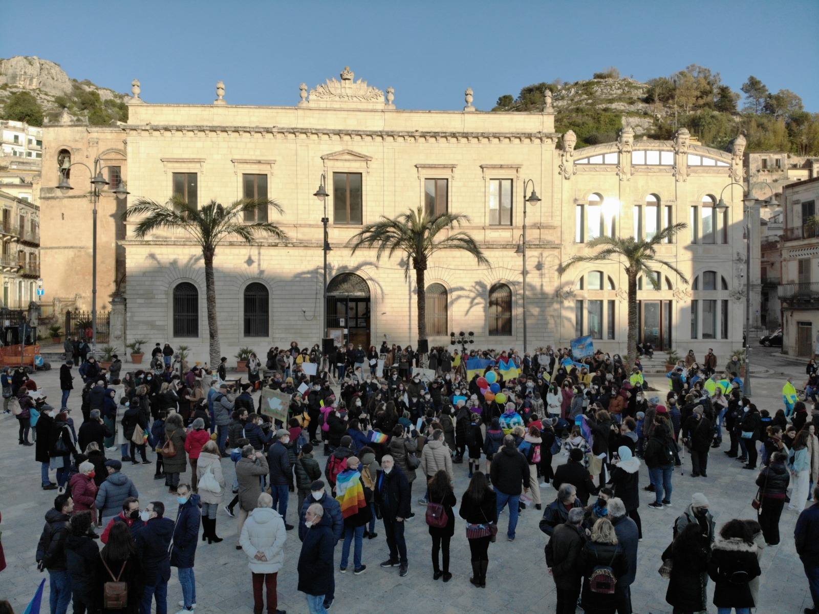 Manifestazione per la pace stasera in Piazza Matteotti a Modica. Presenti associazioni, sindacalisti, politici, scout e comuni cittadini per dire no alla guerra in Ucraina. Totalmente assente il clero.