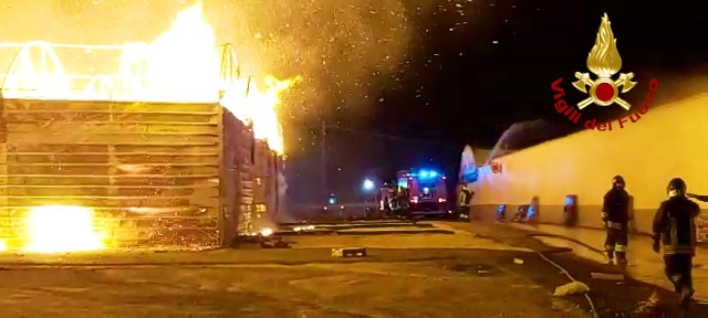 L’incendio originatosi in un piazzale esterno all’azienda in un’area di deposito di pedane e cartoni, ha coinvolto un capannone realizzato con struttura metallica precaria e copertura in telone plastico di circa 2000 mq, all’interno del quale erano stipati ulteriori pedane di cartoni per la realizzazione degli imballaggi. Al fine di ridurre rapidamente il notevole irraggiamento provocato dall’incendio che a causa del vento rischiava di interessare anche l’area delle lavorazioni distante dal capannone in fiamme, non oltre 10 metri, è intervenuto anche un mezzo aeroportuale in sagoma riuscendo in breve tempo a ridurre il calore.