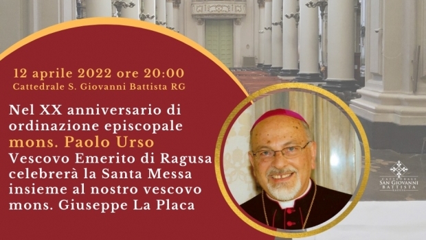Oggi 12 aprile, in occasione del suo ventesimo anniversario di ordinazione episcopale, mons. Paolo Urso, vescovo emerito di Ragusa, celebrerà la Santa Messa insieme al nostro vescovo Giuseppe La Placa. La messa verrà celebrata nella Cattedrale di San Giovanni Battista alle ore 20.