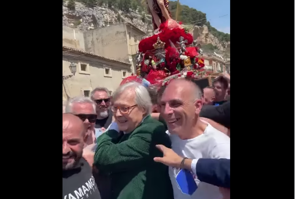 Il critico d’arte Vittorio Sgarbi ha mantenuto la promessa, dopo le polemiche delle scorse settimane sulla celebrazione del “Gioia” a Scicli, e si è presentato nella cittadina facendosi, addirittura, immortalare mentre fa il protatore della statua del Cristo Risorto.