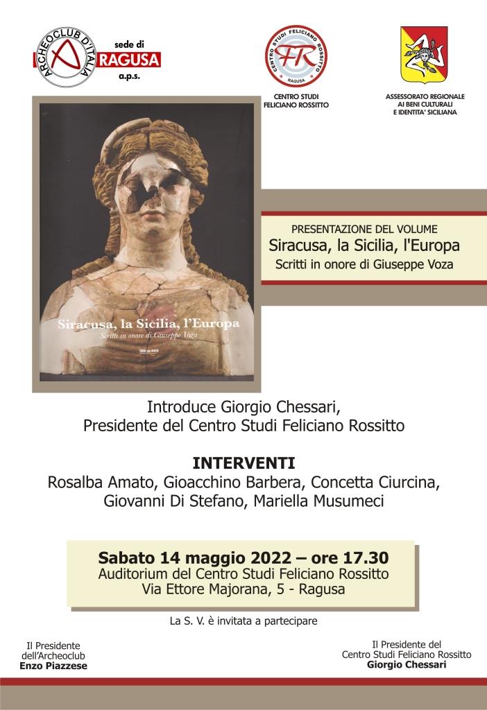 Sabato 14 maggio 2022, alle   17.30, nell’auditorium del Centro Studi Feliciano Rossitto, sarà presentato il volume “Siracusa, la Sicilia, l’Europa. Scritti in onore di Giuseppe Voza” (Ed. Torri del Vento, Palermo, 2020, pp.434, a cura di Rosalba Amato, Gioacchino Barbera, Concetta Ciurcina).
