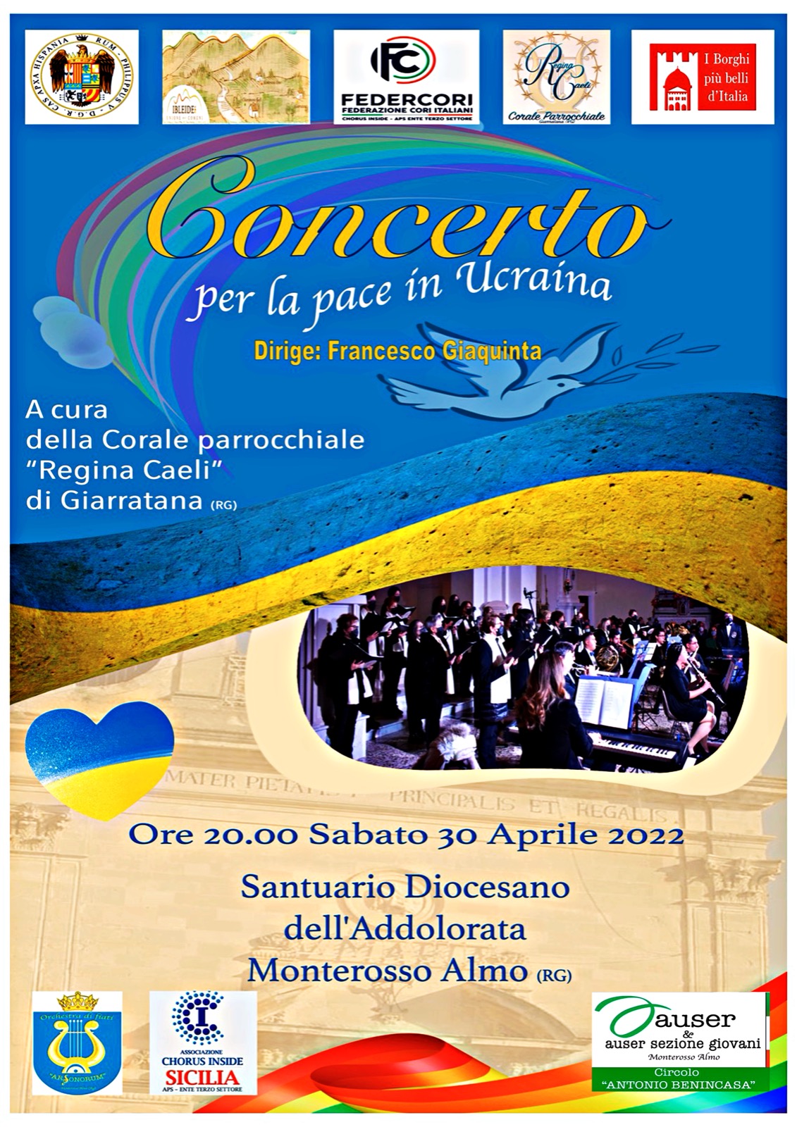 Sabato sera, con inizio alle 20, nel Santuario Diocesano dell’Addolorata si svolgerà un concerto per la pace in Ucraina. Si esibirà l’Orchestra di fiati ArSonorum diretta da Francesco Giaquinta con la presenza della Corale “ Regina Caeli” di Giarratana. La manifestazione concertistica è stata organizzata dal Comune. Di Monterosso Almo.