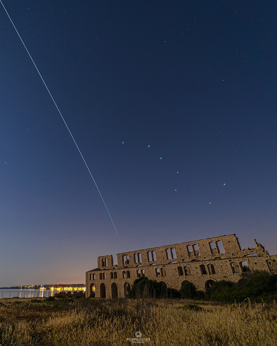 Il 16 Maggio prima dell’inizio dell’eclissi di luna, Filippo Galati ha fotografato un passaggio particolarmente favorevole della Stazione Spaziale Internazionale sui cieli della Sicilia. A fare da cornice l’antica fornace Penna (Sampieri9 ed evidenziata in cielo la costellazione dell’Orsa Maggiore.