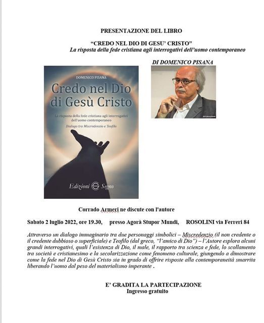 Sarà presentato sabato 2 luglio a Rosolini il libro di Domenico Pisana “Credo nel Dio di Gesù Cristo. La risposta della fede cristiana agli interrogativi dell’uomo contemporaneo. Dialogo tra Miscredenzio e Teofilo”, pagine 188, recentemente lanciato al Salone Internazionale del libro di Torino dalle casa editrice “Edizioni Segno” di Udine.
