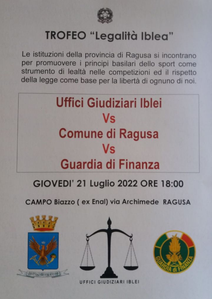 Promuovere i principi basilari dello sport come strumento di lealtà nelle competizioni e il rispetto della legge come base per la libertà di ognuno di noi. È questo lo spirito del triangolare di calcio a 11 organizzato dal Tribunale di Ragusa in occasione della seconda edizione del trofeo “Legalità Iblea” 2022. La manifestazione sportiva che vedrà impegnate le squadre di calcio degli Uffici Giudiziari, del Comune di Ragusa e della Guardia Di Finanza avrà inizio alle 18 di giovedì 21 luglio e si svolgerà presso il campo Biazzo (ex Enal) di via Archimede.