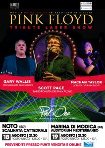 I tre “ospiti” d’onore si esibiranno insieme ai “Pink’s One” nel cuore del Sud Est siciliano, in location uniche ed affascinanti, arricchite da una scenografia curata fin nei minimi dettagli. A fare da sfondo alla musica dei Pink Floyd e ai tre protagonisti del successo globale della band ci sarà infatti, oltre all’iconico schermo circolare utilizzato del gruppo inglese nei propri concerti, anche un gioco di luci e laser che renderanno l’esperienza immersiva e indimenticabile. La tribute band “Pink’s One” si è formata nel 2010 e fin da subito ha raccolto un grande successo di pubblico riproponendo i brani più significativi della vasta discografia della band fondata da Syd Barrett, iniziando a collaborare già dal 2014 con la cantante Machan Taylor che ritroveremo sul palco, straordinariamente insieme a Scott Page e Gary Wallis in queste date siciliane. Si partirà il prossimo 18 agosto nella splendida cornice della scalinata della Cattedrale di Noto. Il giorno successivo, venerdì 19 agosto, sarà la volta di un gradito ritorno all’Auditorium Mediterraneo a Marina di Modica. Ed è già corsa alla prevendita online sulla piattaforma Ctbox per entrambi i concerti promossi da Marco Guastella di Lumia Agency con il supporto del Comune di Noto e del Comune di Modica. Oltre alla prevendita online, è possibile acquistare i biglietti anche presso numerosi punti vendita attivi rintracciabili sulla pagina social ufficiale della band “Pink’s One” facebook.com/pinksoneband