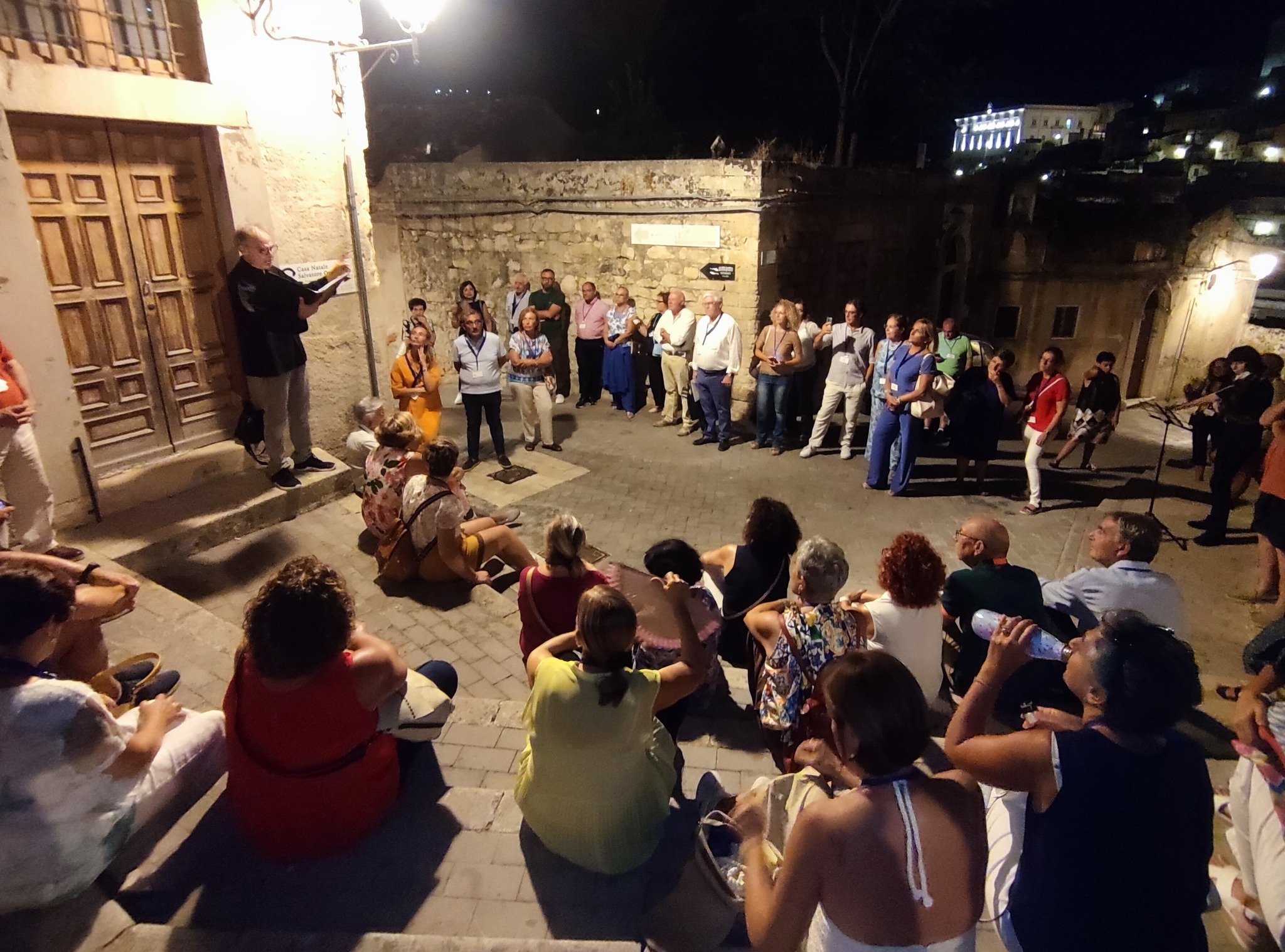 “Alla scoperta dei tesori di Modica”, è stato il titolo di un percorso letterario organizzato domenica 21 agosto dal Lions Club di Modica con la restauratrice Gaetana Ascenzo e l’attore Marcello Sarta accompagnato dalla violinista Sofia Gagliolo. L’itinerario articolato come un viaggio alla scoperta di beni culturali della città si è snodato dalla Chiesa del Carmine per giungere a casa Quasimodo e concludersi in via Grimaldi con la visita della chiesetta rupestre di San Nicolò Inferiore. La restauratrice Gaetana Ascenzo ha illustrato nella Chiesa del Carmine l’Annunciazione del Gagini ed in via S. Maria la lunetta di Berlon opere d’arte restaurate a cura del Lions Club Modica nel 2018 e nel 1985. Lungo il percorso l’attore Marcello Sarta ha recitato brani di autori siciliani fra cui i testi della scrittrice Maria Carmela Miccichè che è stata presente all’evento “ Il Lions Club Modica ha organizzato questo percorso per una valorizzazione del centro storico della città – commenta Giuseppe Mazza, presidente del Lions Club di Modica – anche per far conoscere delle opere come il complesso marmoreo dell’Annunciazione del Gagini al Carmine la lunetta del Berlon che ha restaurato in passato il nostro club. A nome del direttivo e dei soci che mi onoro di rappresentare, ringraziamo tutti coloro i quali si sono spesi per la buona riuscita dell’evento, interpretando lo spirito del “We Serve” del Lions Club International”. Il ricavato dell’evento sarà interamente destinato alla realizzazione di iniziative del Lions club di Modica nei territori di Modica, Pozzallo e Ispica.