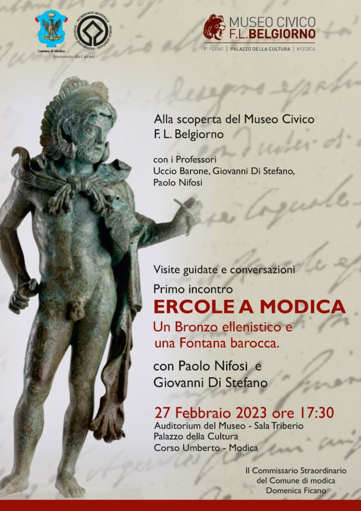 In programma all’Auditorium di Palazzo della Cultura di Modica (Sala Triberio) tre importanti eventi culturali per la promozione delle collezioni del Museo Civico “F.L.Belgiorno”. Gli eventi organizzati dal Direttore onorario del Museo Prof. Giovanni Di Stefano, avranno come protagonisti i professori Paolo Nifosì, Uccio Barone, oltre allo stesso Di Stefano. Il primo appuntamento, previsto il 27 febbraio alle ore 18.00, riguarderà un tema intrigante: Modica ed Ercole. Il prof. Nifosi, notissimo Storico dell’arte, presenterà’ alcuni documenti su una fontana con una statua di Ercole a Modica nel XVI secolo e Giovanni Di Stefano parlerà della statua in bronzo di era ellenistica esposta al Museo. Questo primo appuntamento, con questi inediti resoconti, sarà un intreccio fra il mito di Ercole e la città di Modica. Seguiranno altri importanti momenti su Quasimodo e la sua collezione e su l’unità e i reperti del Museo. Gli altri appuntamenti sono previsti il 5 marzo, visita guidata al Museo con Giovanni Di Stefano e il 21 aprile. Di grande spessore Culturale – ha dichiarato il Commissario Straordinario Domenica Ficano – saranno le relazioni che svolgeranno i relatori sui beni archeologici e storico-artistici esposti nel Museo.