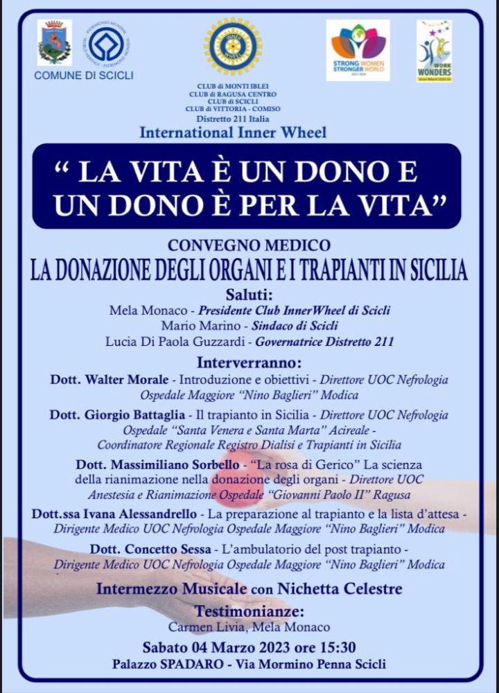 Sabato a Scicli, a Palazzo Spadaro, organizzato dal Club Inner Wheel di Scicli, al quale si sono uniti i Club Inner dell’area iblea, Monti Iblei, Ragusa Centro e Vittoria Comiso, presente la Governatrice del Distretto 211, Lucia Di Paola Guzzardi, si è tenuto un un interessantissimo convegno medico sulla donazione degli organi e sui trapianti in Sicilia, dal titolo emblematico “La Vita è un dono e un Dono è per la Vita”. Il convegno fortemente voluto dalla presidente del club di Scicli, Mela Monaco, particolarmente sensibile a questo tema, ha visto il succedersi degli interventi appassionati e coinvolgenti di cinque medici impegnati in questo ramo della medicina, che hanno toccato tutti i passaggi da quando il paziente scopre la malattia al percorso che deve fare per giungere al trapianto e le cure nel post trapianto. Sono seguite le condivisioni di due persone trapiantate la cui storia e il loro grazie allo sconosciuto donatore che ha consentito la loro rinascita, ha profondamente toccato i presenti. A fine serata ad allietare il folto pubblico un susseguirsi di brani inneggianti alla vita magistralmente suonati al pianoforte da Nichetta Celestre.