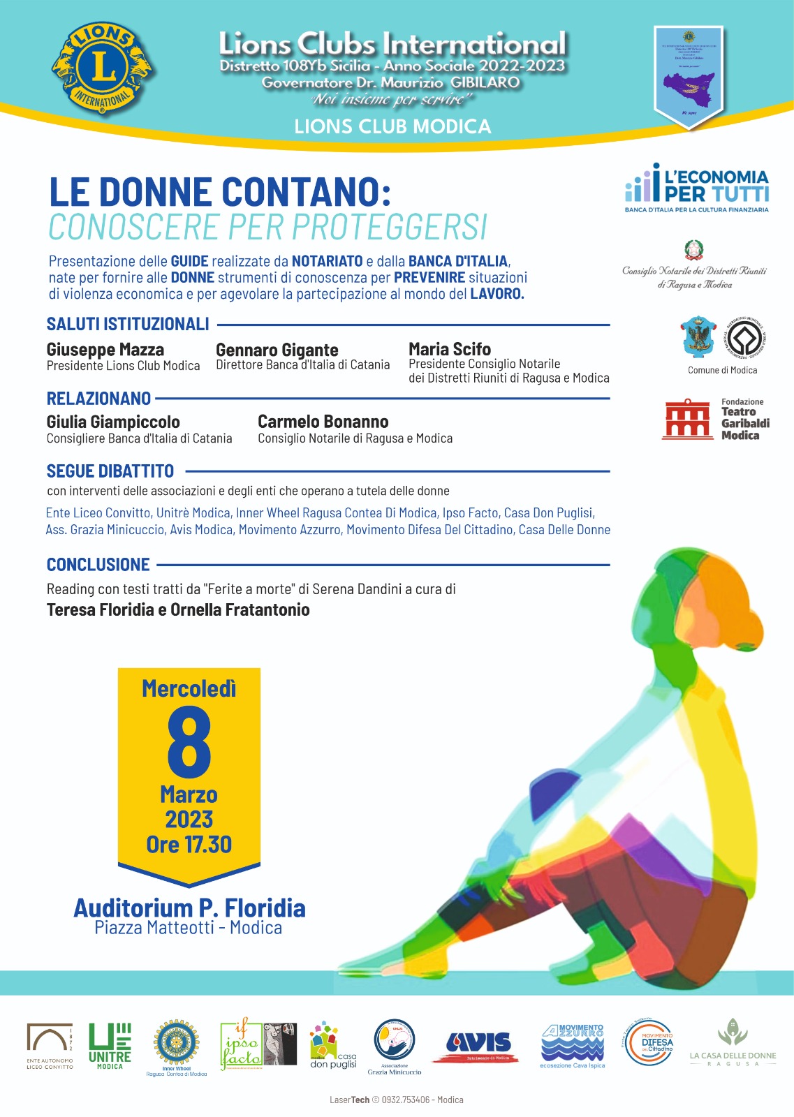 Si terrà a Modica mercoledì 8 marzo, in occasione della Giornata internazionale della donna, alle ore 17,30 presso l’Auditorium Floridia in piazza Matteotti, l’incontro pubblico promosso dal Lions Club Modica, in collaborazione con il Consiglio Notarile dei Distretti riuniti di Ragusa e Modica e la sede di Catania della Banca d’Italia, per presentare la Guida “Conoscere per proteggersi”, elaborata dalla Commissione Pari Opportunità del Consiglio Nazionale del Notariato, allo scopo di fornire alle donne gli adeguati strumenti di conoscenza per: prevenire gli abusi, agevolare la loro partecipazione al mondo del lavoro e contribuire a realizzare una vera parità di genere. Il Lions Club Modica, impegnato nella prevenzione della violenza di genere, ha organizzato l’evento per prevenire la violenza economica contro le donne, un fenomeno subdolo non facilmente riconoscibile perché spesso le donne che ne sono vittima non ne hanno la consapevolezza. Si tratta di situazioni diffuse come sfruttamenti e raggiri economici (ad esempio, l’inconsapevole sottoscrizione di finanziamenti o garanzie), di controllo completo delle risorse economiche, fino allo stato di completa dipendenza economica raggiunto attraverso l’induzione alla rinuncia al proprio posto di lavoro o alla sua ricerca. La conoscenza è infatti senza dubbio uno dei principali strumenti di difesa contro i possibili soprusi. L’inconsapevolezza e l’incompetenza vengono spesso sfruttate per compiere prevaricazioni e violenze, che non sono solo fisiche, ma anche economiche, verso le persone più deboli, tra le quali spesso vi sono le donne.