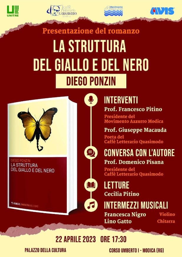 Al centro della serata la presentazione del romanzo “La struttura del giallo e del nero”, che sarà presentato da Franco Pitino, Presidente del Movimento Azzurro, Giuseppe Macauda, poeta del Caffè Quasimodo. Domenico Pisana, Presidente del Caffè Quasimodo, terrà una conversazione con l’autore.