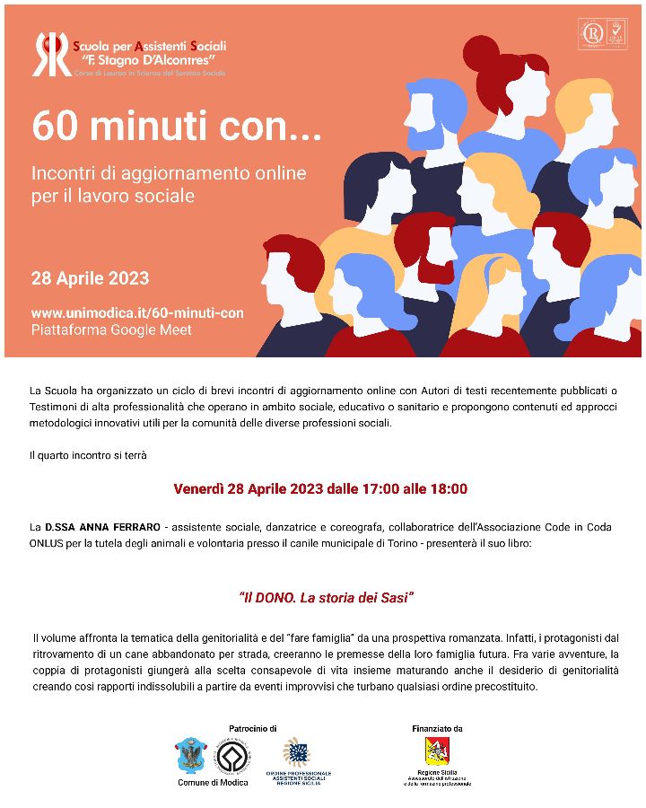 Quarto appuntamento con “i 60 minuti con…” – il ciclo di incontri brevi di aggiornamento online, organizzato dalla Scuola per Assistenti Sociali “F. Stagno D’Alcontres” di Modica (www.unimodica.it) e rivolto a tutti gli operatori sociali del territorio ibleo. L’iniziativa – finanziata dalla Regione Sicilia – ha come finalità quella di offrire alla comunità professionale, attiva negli ambiti sociale, educativo e giuridico, un’occasione di confronto e dialogo con prestigiosi autori di testi pubblicati di recente che trattano tematiche rilevanti in termini di innovazione ed evoluzione metodologica.