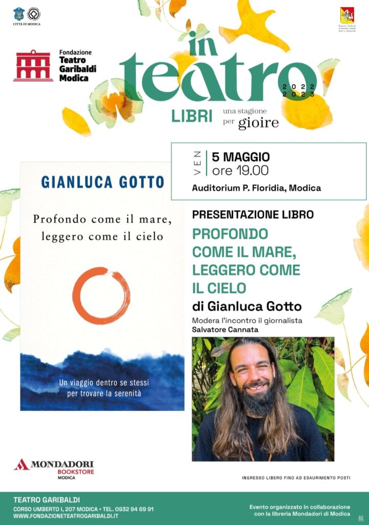 Manca poco, una settimana e qualche ora e poi Gianluca Gotto sarà a Modica, all’auditorium di piazza Matteotti, in una delle sue due uniche tappe siciliane per presentare ‘Profondo come il mare, leggero come il cielo’, il suo ultimo libro che lo racconta e dove si racconta. Venerdì 5 maggio, alle 19, l’incontro con Gotto nell’evento di Mondadori BookStore Modica con Fondazione Garibaldi, per la stagione di InTeatroLibri. Un vero e proprio evento, vista la grandezza del personaggio, Gianluca Gotto, la sua straordinaria vita, i suoi racconti, il suo viaggiare e le vie intraprese verso la serenità che è cifra caratterizzante della sua esistenza. Avrà tanto da raccontare Gianluca Gotto e lo farà a Modica in un libro dove condivide il suo viaggio interiore, la calma della mente, i maestri che lo hanno spinto e accompagnato, i luoghi calmi e delle quiete interiore ed esteriore, i pensieri che scivolano via, guardando l’esistenza con occhi diversi, quelli dell’accettazione senza subire, essendo lui il cielo e non le nuvole. La vita da vivere e vedere da una prospettiva diversa perché sia migliore, trasformando i periodi difficili in miracolose rinascite, attraverso saggezza che è consapevolezza. Per diventare la persona che ognuno merita di essere: compassionevole, presente, gentile, felice, saggia e, soprattutto, serena
