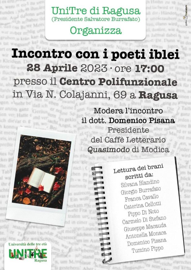 Si terrà domani alle ore 17.00, presso il Centro Polifunzionale di Ragusa, un incontro di poeti iblei. A organizzare l’evento è l’ UniTre di Ragusa, presieduta da Salvatore Burrafato.