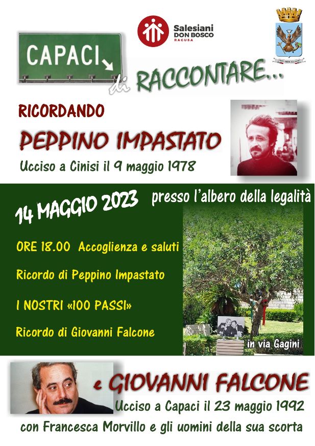 Domenica 14 maggio, alle ore 18, presso l’albero della legalità, di fronte alla parrocchia dei Padri Salesiani a Ragusa, si terrà un incontro di riflessione per onorare la memoria di Peppino Impastato e Giovanni Falcone, uccisi dalla mafia rispettivamente il 9 maggio 1978 a Cinisi e il 23 maggio 1992 a Capaci, insieme alla moglie Francesca Morvillo e alla scorta, composta dagli agenti Vito Schifani, Rocco Dicillo e Antonio Montinaro.