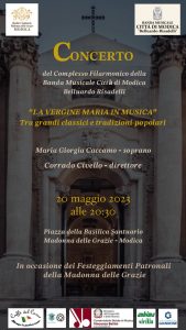 In occasione dei festeggiamenti Patronali in onore della Madonna delle Grazie a Modica, il Complesso Filarmonico della Banda Musicale Città di Modica “Belluardo-Risadelli” si esibirà in concerto alle 20:30 presso la basilica di Modica Bassa. Durante l’esibizione i musicisti della Banda modicana suoneranno grandi classici e brani tradizionali popolari mariani eseguiti dal soprano Maria Giorgia Caccamo e dal direttore Corrado Civello.