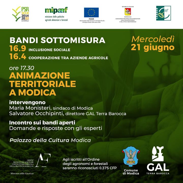 L’incontro del 21 giugno vedrà la partecipazione del sindaco di Modica, Maria Monisteri e di Salvatore Occhipinti, direttore del GAL Terra Barocca. Durante l’incontro, gli esperti forniranno informazioni dettagliate sui bandi e risponderanno alle domande degli interessati.