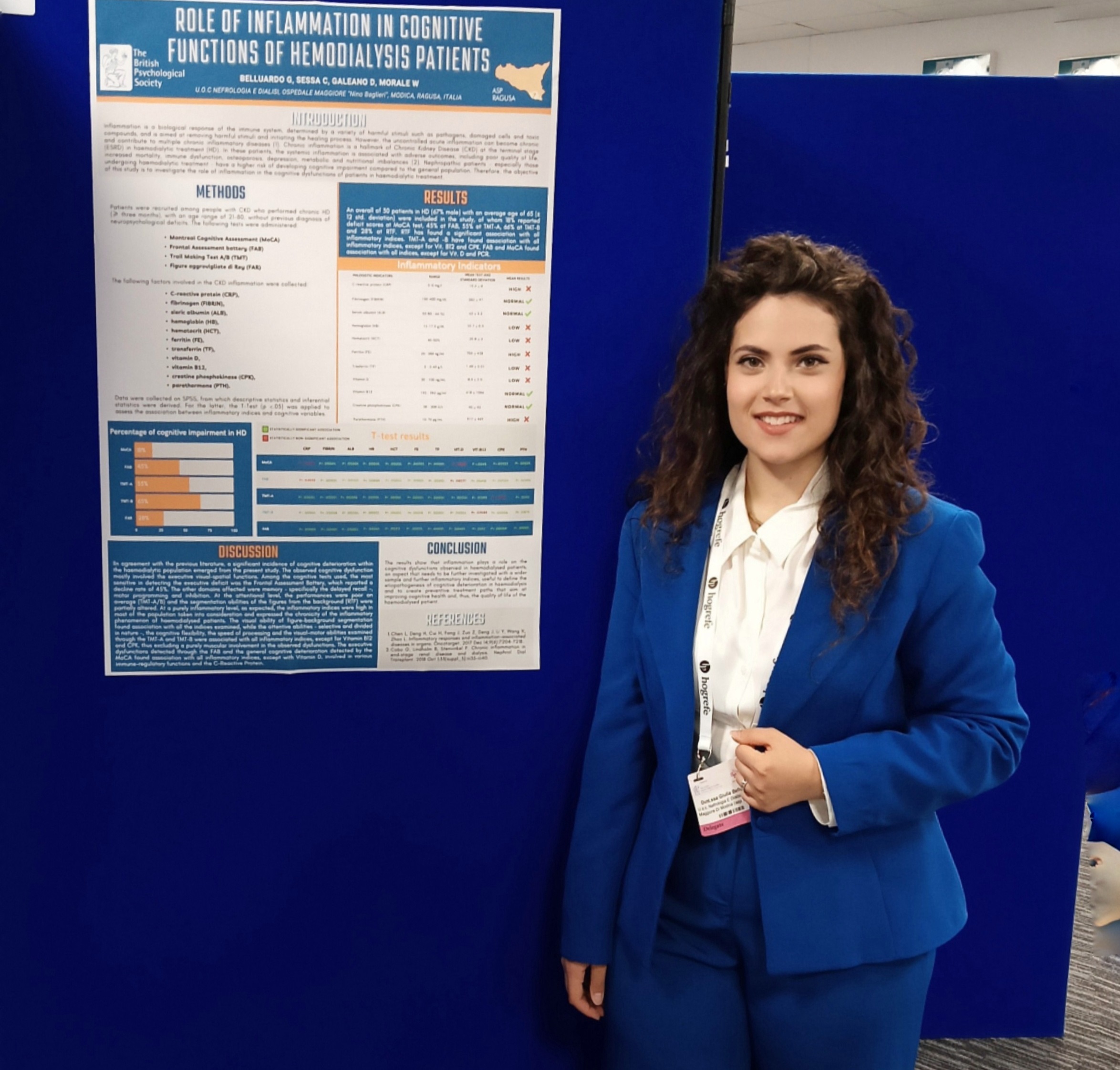 La modicana Giulia Belluardo, dottoressa in Neuroscienze cognitive, ha presentato al 18th Congresso Europeo di Psicologia uno studio condotto presso l’U.O.C di Nefrologia e Dialisi di Modica (ASP 7 Ragusa) sul ruolo dell’infiammazione nelle disfunzioni cognitive dei pazienti emodializzati. L’evento, tenutosi dal 3 al 6 luglio a Brighton (Inghilterra, UK), ha rappresentato una grande occasione per divulgare i risultati scientifici nell’ambito della ricerca ed è considerato un’opportunità unica di confronto con i maggiori esperti di psicologia di tutta Europa. La ricerca di cui coautori sono stati i dottori Concetto Sessa,  Dario Galeano ed il direttore dell’unità Walter Morale, esplora un ambito ultra specialistico e poco conosciuto, quale quello delle disfunzioni cognitive in area nefrologica, e mira a gettare nuova luce sulla salute cerebrale e cognitiva dei pazienti in emodialisi. L’alta prevalenza di deterioramento cognitivo della popolazione emodializzata non ha ancora oggi un definito meccanismo fisiopatologico sottostante. A questo proposito lo studio condotto ha voluto indagare il ruolo dell’infiammazione, marker della malattia renale cronica allo stadio terminale (ESRD), nel deterioramento cognitivo riscontrato. Dai risultati è emersa una forte associazione tra gli indici infiammatori e gli indici cognitivi rilevati tramite test neuropsicologici. Il lavoro è stato accolto con grande entusiasmo, guadagnandosi il plauso della comunità europea, ed apre a nuovi quesiti di ricerca utili a tracciare percorsi di cura e prevenzione ad ampio respiro.