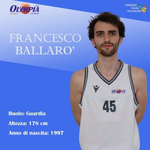 Nel dare il bentornato nella sua casa cestistica a Mattia Lena, la dirigenza ha nel contempo confermato la presenza nel roster di un altro giocatore tesserato Olympia: trattasi del vittoriese Francesco Ballarò, guardia classe ‘97, distintosi per l’impegno profuso nella scorsa stagione a favore della squadra nel percorso che ha portato alla vittoria del campionato di Serie C Silver.