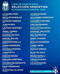 L’allenatore della nazionale campione del mondo dell’Argentina, Lionel Scaloni, ha annunciato la lista dei convocati per le partite contro Ecuador e Bolivia per le qualificazioni ai Mondiali del 2026. I 32 giocatori nominati da Scaloni sono guidati dal capitano Lionel Messi, dell’Inter Miami; Ángel Di María, del Benfica; e Rodrigo de Paul, dell’Atlético Madrid. Tra quelli che rientrano nella lista spiccano il portiere Franco Armani e Ángel Correa, assenti nella precedenza lista di convocati. Sono rimasti fuori dalla lista giocatori di grande qualità come Paulo Dybala della Roma sempre più spesso colpito da infortuni; Gerónimo Rulli dell’ Ájax e Geovani Lo Celso del Tottenham. Anche Joaquín Correa, appena arrivato al Marsiglia, dall’Inter è rimasto fuori. Nella lista dei convocati spiccano i nomi degli under 23: Lucas Beltrán (22 anni), l’attaccante Alan Velasco (21), il centrocampista Bruno Zapelli (21) e il difensore Lucas Esquivel (21). Gli attuali campioni del mondo esordiranno giovedì prossimo, 7 settembre, contro l’Ecuador.