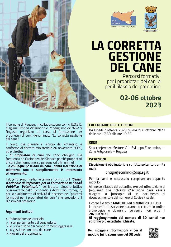 L’Unità Operativa Semplice Dipartimentale di Igiene Urbana Veterinaria e Randagismo dell’ASP di Ragusa, in collaborazione con il comune di Ragusa, organizza un corso di formazione per proprietari di cani, denominato “La corretta gestione del cane”. Possono partecipare tutti i cittadini proprietari di cani o anche solo interessati agli argomenti trattati. Il corso è conforme al decreto ministeriale 26 novembre 2009 ed è diretto anche a coloro che sono obbligati dai sindaci, tramite ordinanza, ad acquisire il patentino perché proprietari di cani che hanno morso persone o altri animali.