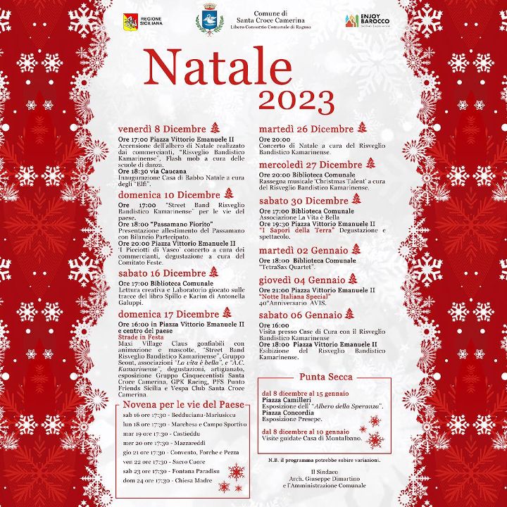 Avrà inizio l’otto dicembre, con l’accensione dell’albero di Natale in piazza Vittorio Emanuele II, il cartellone degli eventi natalizi programmati dall’Amministrazione comunale di Santa Croce Camerina ed elaborato dall’assessore Caterina Gambino. Un mese tra animazione, cultura, musica e degustazioni, all’insegna della tradizione, per dare la possibilità ai cittadini di vivere la propria città in un clima unico, come solo le feste natalizie sanno essere. “Con un occhio al bilancio e con la fondamentale collaborazione dei commercianti e delle associazioni – dice il sindaco Peppe Dimartino – anche quest’anno presentiamo il nostro cartellone del Natale con il quale abbiamo cercato di accontentare tutte le fasce d’età, con l’invito ad animare quanto più possibile le nostre strade e rendere così ancora più coinvolgente l’atmosfera natalizia”. Per i più piccoli, dall’8 dicembre, sarà attiva in via Caucana la casa di Babbo Natale, a cura degli “Elfi”. Tra gli eventi, il concerto dei Picciotti di Vasco, domenica 10 dicembre in piazza Vittorio Emanuele; quindi la domenica successiva, sempre in piazza Vittorio Emanuele II, grande festa con il maxi village Claus, con i gonfiabili per i bambini e ancora degustazioni ed esposizioni. Martedì 26 dicembre, giorno di Santo Stefano, concerto di Natale, a cura del Risveglio bandistico Kamarinense e il giorno successivo, rassegna musicale Christmas Talent, il 30 dicembre la manifestazione “I sapori della terra”, finanziata con il contributo della Regione Sicilia. “Il cartellone degli spettacoli natalizi – conclude il primo cittadino – è un invito a vivere la città e condividere il senso di appartenenza. Le festività natalizie sono un’opportunità per rafforzare i legami tra di noi e creare una comunità ancora più coesa e solidale. Mai come quest’anno sono necessari auguri di amore e serenità”.