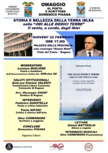 L’appuntamento di giovedi prossimo che vorrà essere un omaggio a Domenico Pisana, sarà moderato dal poeta e fondatore dell’Associazione culturale “Officina 90”, Lorenzo Migliore, e sarà anche l’occasione per presentare il libro “Odi alle dodici terre. Il vento a corde dagli Iblei”. A presentare l’opera italiano-inglese dello scrittore modicano, pubblicata da Armando Siciliano editore, con copertina e 30 opere all’interno del Maestro Piero Guccione , saranno il poeta e critico letterario, Federico Guastella, il critico e storico dell’arte Paolo Nifosì, e Gino Carbonaro, scrittore e saggista, che eseguirà anche degli intermezzi musicali alla fisarmonica, mentre l’apprezzato attore e regista Gianni Battaglia leggerà alcune “Odi”.