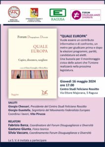 Sempre in tema di iniziative culturali, giovedì 16 maggio alle ore 17.00 presso l’Auditorium del Centro Studi Rossitto a Ragusa in Via Ettore Majorana, 5, si terrà l’incontro sul tema “Quale Europa. Capire, discutere, scegliere”. La cogente ed attualissima questione vuole essere un contributo informativo e di confronto, un metro per giudicare prima e dopo le elezioni programmi, partiti, candidature ed eletti.