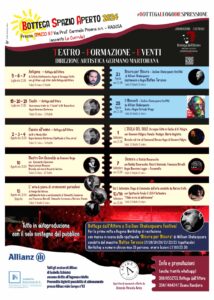 Si, nelle locandine c’è la possibilità di visionare la location e gli orari. Inoltre tutti gli eventi saranno anticipati da un piccolo aperitivo di benvenuto. Tengo a sottolineare che gli spettacoli sono autoprodotti, e proprio per questo voglio ringraziare il pubblico. Non abbiamo nessun patrocinio, né comunale né regionale. Solo tanto sudore, amore per il teatro e rischio. Quindi invitiamo il nostro pubblico a sostenerci in questa folle impresa.