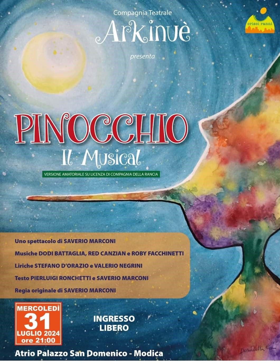 Questa sera, 31 luglio, presso l’Atrio comunale di Modica con ingresso libero, la compagnia la compagnia teatrale Arkinuè porta in scena Pinocchio – Il musical -, un affascinante spettacolo creato dalla Compagnia della Rancia e basato sull’omonimo romanzo di Carlo Collodi. Le musiche e le liriche utilizzate sono state scritte dai Pooh.