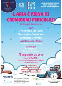Stasera alle ore 21.00, in via Prof. Carmelo Pisana a Ragusa, sarà portato in scena lo spettacolo “L’aria è piena di cromosomi pericolosi” di Giorgio Bertolusso, con Francesca Morselli, Simonetta Cuzzocrea, Marilena Trovato, adattamento e regia Simonetta Cuzzocrea, aiuto regia Pino Migliorisi e Giovanni Dimartino.