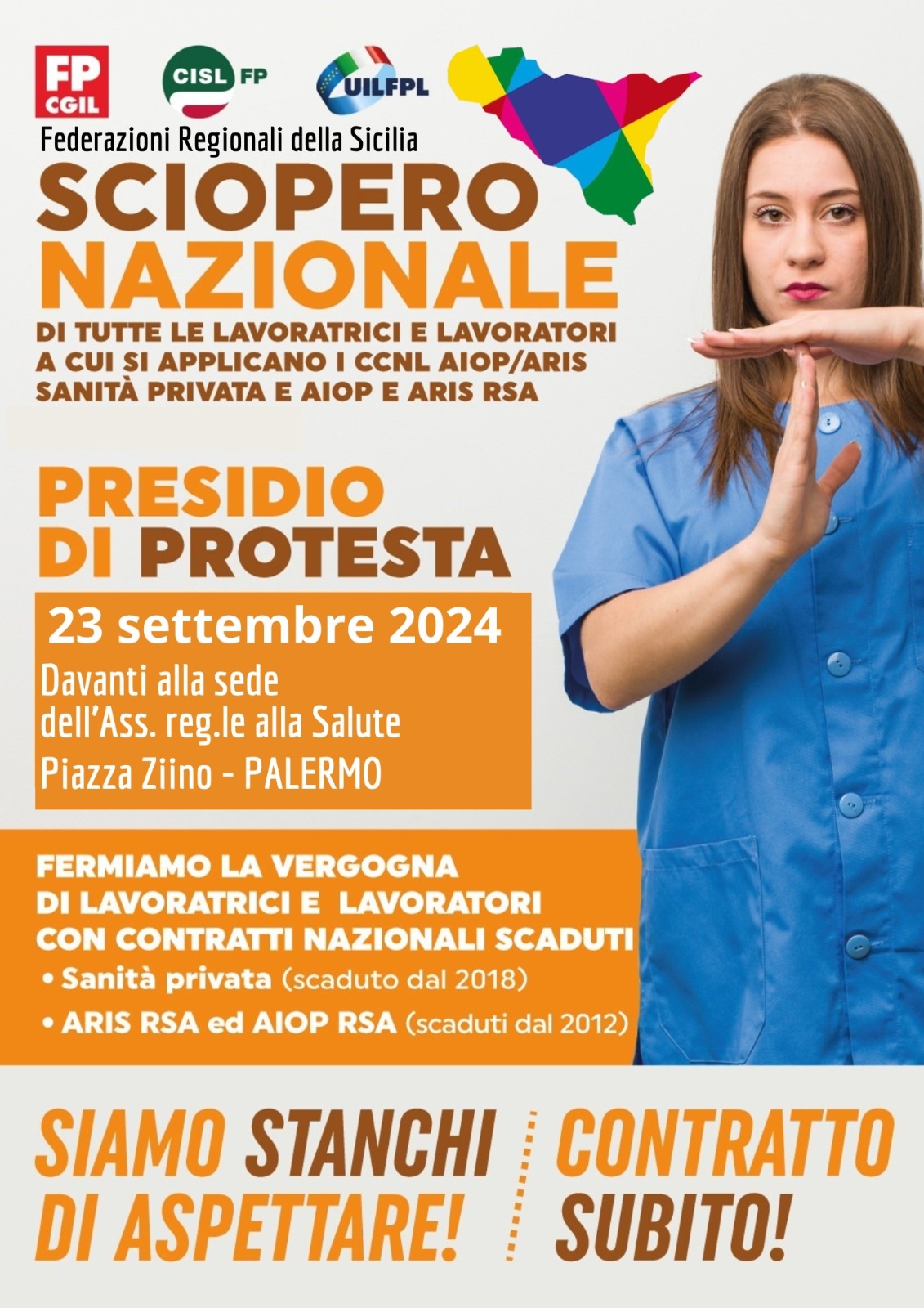 Le segreterie regionali siciliane di Fp Cgil, Cisl Fp e Uil Fpl aderiscono allo sciopero nazionale per l’intera giornata del 23 settembre di tutti i dipendenti delle strutture nelle quali si applicano i contratti nazionali del lavoro Aiop/Aris sanità privata, Aiop Rsa e Aris Rsa-Cdr. L’astensione dal lavoro sarà prevista per ogni turno di lavoro. Durante lo sciopero saranno garantiti i contingenti di personale a garanzia dei servizi minimi previsti dagli accordi in vigore.