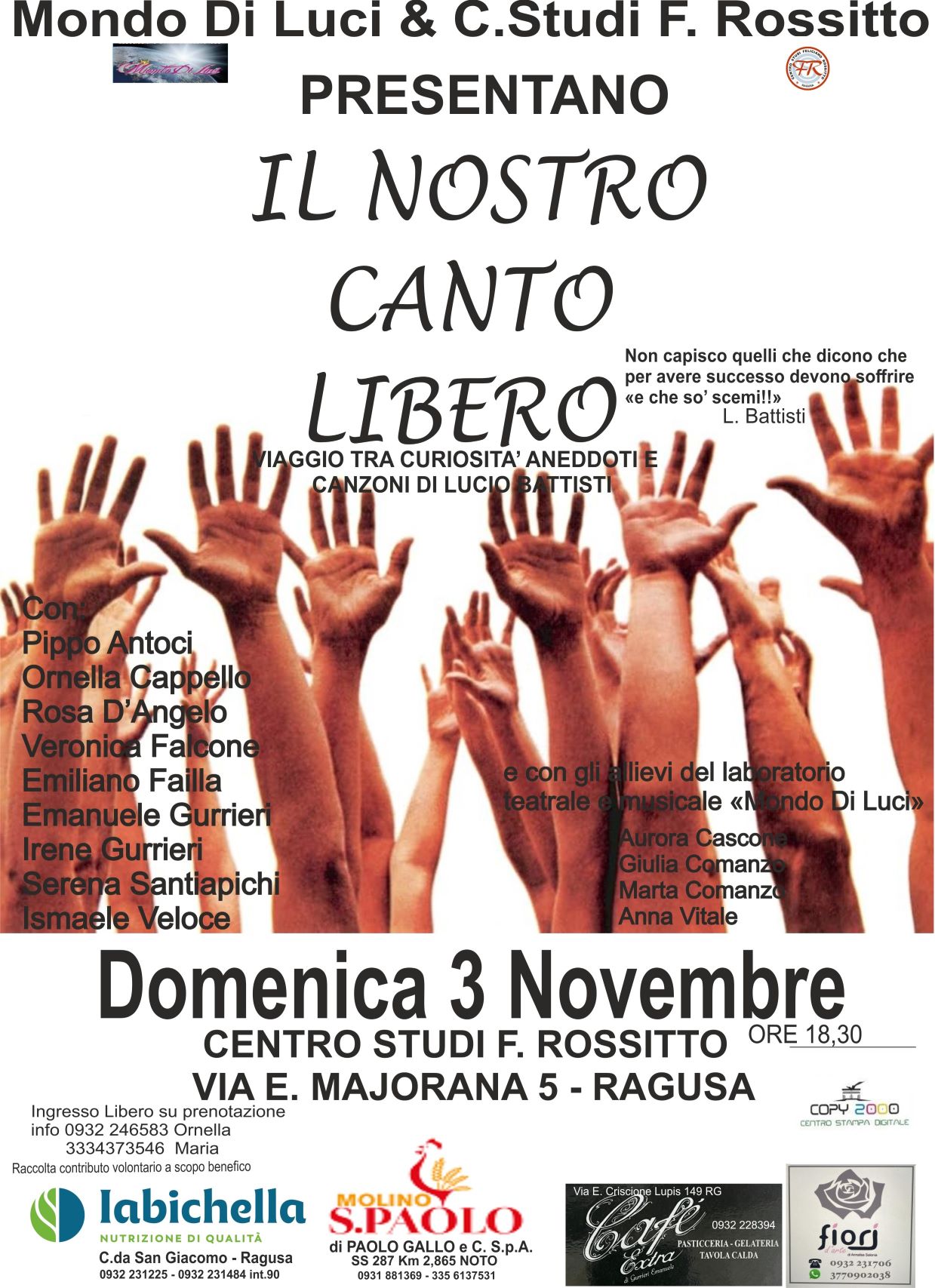 Domenica 3 novembre 2024, alle 18.30, Modo di Luci e Centro Studi Feliciano Rossitto presentano “Il nostro canto libero”, viaggio tra curiosità, aneddoti e canzoni di Lucio Battisti. L’iniziativa si terrà presso lo stesso Centro studi Rossitto (Via Ettore Majorana, 5 – Ragusa).