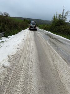 Un’ improvvisa e forte grandinata ha colpito oggi dopo le 14 alcune strade comunali e provinciali che portano a Monterosso. In particolare la strada provinciale 62 all’altezza di contrada Chiusa e fino al bivio per Giarratana e la strada comunale in contrada Margi. Le autovetture che transitavano in quel momento hanno marciato a passo d’uomo tanta era la grandine sul manto stradale. Per mettere in sicurezza questi tratti stradali sono intervenuti prontamente i Rangers Europa di Monterosso con il loro potente mezzo un Bucher Bu 200 4×4 fornito di lana spazzaneve . Nella foto di oggi pomeriggio i Rangers con il loro potente mezzo in contrada Margi mentre liberano la strada dai cumuli di grandine .